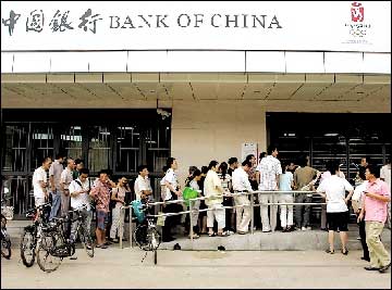 市民王先生說(shuō),前天,他在報(bào)紙上看到中國(guó)人民銀行將于昨天發(fā)行10元奧運(yùn)紀(jì)念鈔,因?yàn)橄氲街袊?guó)銀行是奧運(yùn)會(huì)合作伙伴,昨天一大早,他就趕到中行知春路支行等候購(gòu)買奧運(yùn)紀(jì)念鈔。當(dāng)王先生到達(dá)銀行門(mén)口時(shí),近300名市民早已在此排起長(zhǎng)隊(duì)。