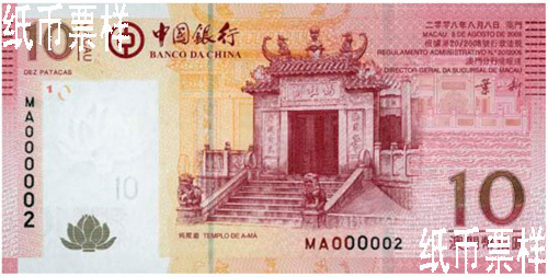10元、20元、50元、100元、500元、1000元六種面值的主景圖案按歷史脈絡(luò)編排,分別是媽閣廟、大三巴牌坊、崗頂劇院、東望洋炮臺(tái)、鄭家大屋和民政總署大樓。鈔票背面以澳門(mén)中國(guó)銀行大廈為主景圖案,襯景選取澳門(mén)四座大橋形象,寓意澳門(mén)在中西方文化交流中和澳門(mén)元在澳門(mén)經(jīng)濟(jì)發(fā)展中具有的橋梁作用。