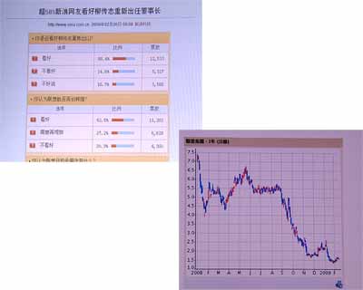 2月5日,聯(lián)想宣布柳傳志重掌聯(lián)想的消息后,新浪網(wǎng)隨后對柳傳志復(fù)出進行了問卷調(diào)查。截至第二天上午九點就有兩萬余人參與調(diào)查,結(jié)果顯示:58.4%的網(wǎng)友看好柳傳志重新出任董事長,選擇不看好的只有24.8%,認為聯(lián)想因此能再創(chuàng)輝煌的網(wǎng)友達52.5%,市場層面也反應(yīng)積極,聯(lián)想集團股票在2月6日大漲11%,而在今年以來,聯(lián)想股價已經(jīng)下跌了33%。
