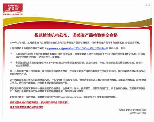 對(duì)于報(bào)道中介紹的那些患兒,我深表關(guān)切,我們理解父母?jìng)儞?dān)憂的心情。但迄今沒(méi)有醫(yī)學(xué)報(bào)告可以證明任何多美滋產(chǎn)品與這些病癥的關(guān)聯(lián)性。我想再次向我們的員工申明,多美滋在國(guó)內(nèi)生產(chǎn)銷售的奶粉全部符合中國(guó)相關(guān)標(biāo)準(zhǔn)。所有批次的產(chǎn)品都經(jīng)過(guò)了官方認(rèn)證的實(shí)驗(yàn)室的檢驗(yàn),被確認(rèn)不含三聚氰胺。同時(shí),質(zhì)檢系統(tǒng)駐廠人員還在對(duì)我們(當(dāng)然還有其它所有的乳品品牌)的生產(chǎn)和產(chǎn)品質(zhì)量進(jìn)行不間斷的監(jiān)督。