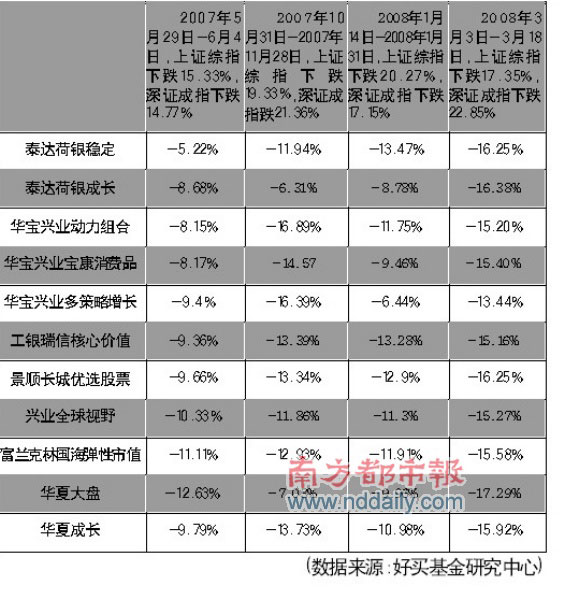 3月份以來,受到股市拖累的股票型基金,凈值下跌最少的也有10%,最多損失超過24%.然而同樣是凈值縮水,今年以來績優(yōu)與績差基金之間的差距居然高達30%,尋找抗跌的基金已經(jīng)成為今年基金投資的一個主要命題。好買基金研究中心樂嘉慶指出,從去年5月底至今,股市共經(jīng)歷了4個跌幅超過15%的階段。在4個階段中比較抗跌的基金表現(xiàn)出兩大特點,一是行業(yè)投資比較均衡的基金,另一個則是規(guī)模適中,倉位調整迅速的基金。