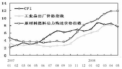 當(dāng)前經(jīng)濟(jì)生活中面臨的主要問(wèn)題有:通貨膨脹壓力較大,煤電油運(yùn)供應(yīng)趨緊,農(nóng)業(yè)增長(zhǎng)基礎(chǔ)尚不牢固,金融機(jī)構(gòu)的流動(dòng)性過(guò)剩,資產(chǎn)價(jià)格特別是股市價(jià)格波動(dòng)較大,節(jié)能減排形勢(shì)嚴(yán)峻等。其中,最為突出的問(wèn)題是通貨膨脹壓力較大。今年2月至4月,我國(guó)居民消費(fèi)價(jià)格指數(shù)(CPI)連續(xù)3個(gè)月漲幅超過(guò)8%,5月份CPI同比上漲7.7%,環(huán)比下降0.4%,其主要原因是蔬菜水果的產(chǎn)銷逐漸進(jìn)入旺季,帶動(dòng)食品價(jià)格漲幅有所回落。但今年下半年CPI仍將面臨較大的上漲壓力,主要表現(xiàn)在如下幾個(gè)方面: