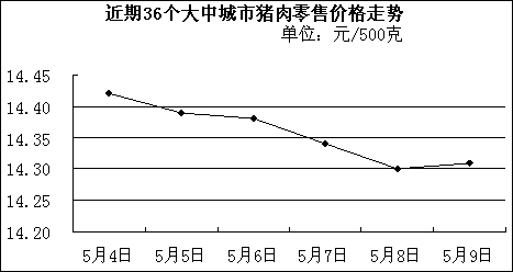 中新網(wǎng)5月12日電 國家發(fā)改委網(wǎng)站消息稱,據(jù)國家發(fā)展改革委價格監(jiān)測中心監(jiān)測,上周(5.5-5.11,下同)全國36個大中城市豬肉(精瘦肉)平均零售價格每500克為14.34元,比前一周(4.28-5.4,下同)下降0.76%。