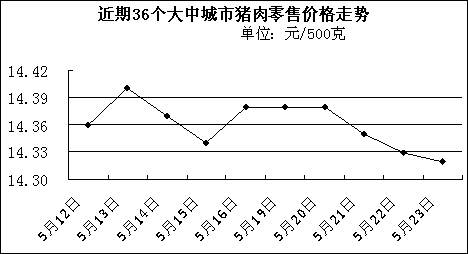 中新網5月26日電 中國國家發(fā)改委網站消息,據國家發(fā)改委價格監(jiān)測中心監(jiān)測,上周(5月19日—5月23日)36個大中城市豬肉(精瘦肉)平均零售價格每500克為14.35元,比前一周(5月12日—5月16日)下降0.14%。