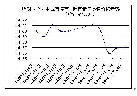 中新網(wǎng)7月28日電 國(guó)家發(fā)改委網(wǎng)站消息,據(jù)國(guó)家發(fā)展改革委價(jià)格監(jiān)測(cè)中心監(jiān)測(cè),上周(2008.7.21-2008.7.25,下同)全國(guó)36個(gè)大中城市集市、超市豬肉(精瘦肉)平均零售價(jià)格每500克為14.38元,與前一周(2008.7.14-2008.7.18,下同)相比下降0.13%。