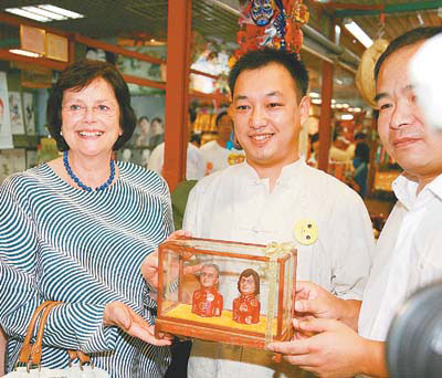8月11日上午,羅格夫人安妮來(lái)到名聞海外的北京秀水街。一見(jiàn)“面人楊”師傅拿出的兩對(duì)精美的面人塑像,她笑了起來(lái)。