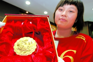 “一共只進(jìn)了兩塊大的‘黃金月餅’!鄙虉(chǎng)工作人員說(shuō),這些“黃金月餅”是從深圳一家公司進(jìn)的貨,剛擺出來(lái)不久,雖然引起不少消費(fèi)者的喜愛(ài),但由于價(jià)格較高,兩塊大“月餅”至今還沒(méi)賣出去,“前天賣了兩套小‘月餅’!