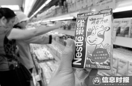 在家樂福超市萬國廣場店,記者看到光明純牛奶250毫升裝悄然回歸賣場;在吉之島超市天河城店,記者看到,昨日還未貼上綠簽的雀巢巧克力味和草莓味的配制型含乳飲料,昨日悄然換新裝。其生產(chǎn)日期標(biāo)注為“2008年6月6日”,早于9月14日這一“分水嶺”。同時(shí),記者在7-11便利店天河南店也看到了雀巢這兩款配制型含乳飲料重新擺上貨架售賣。