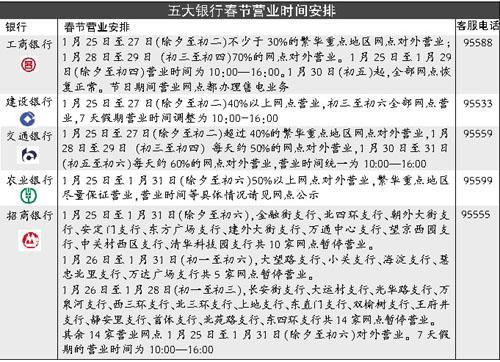 記者20日上午從工行、建行、招行等銀行獲悉,春節(jié)期間的網(wǎng)點(diǎn)營(yíng)業(yè)安排已出爐。