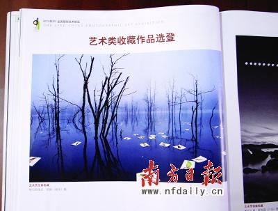 這件摘得藝術(shù)類金獎的作品《明天的現(xiàn)實》,用觀念藝術(shù)的手段再現(xiàn)了地球環(huán)境末日的一處情境:深藍(lán)的河水漫向枯敗的樹林,從地球上滅絕的鳥類照片散落著漂向枯木林深處。但是陳聯(lián)軍發(fā)現(xiàn),這幅照片的背景———水中的枯木林懷疑是作者“盜用”外國人作品。昨天記者在采訪中獲悉,中國攝影家協(xié)會已介入調(diào)查此事。