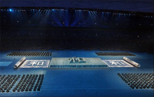 2008年北京奧運(yùn)會開幕式上,幾百名演員扮演的活字印刷字模通過不斷變幻,用大篆、小篆、楷書三種不同字體展現(xiàn)了同一個(gè)漢字——“和”。