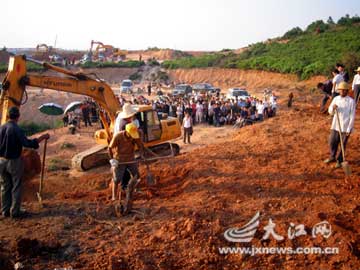 昨日,為保證發(fā)掘工作的順利進行,警方已經(jīng)在發(fā)掘現(xiàn)場拉起警戒線。在古墓上方的山坡上,工人們正在用鐵鍬清理黃土。由于圍觀群眾增多,當?shù)鼐讲坏貌粻砍龇辣┤S持秩序。目前,當?shù)鼐皆雠删,駐守于古墓旁,24小時守護,防止不法分子破壞古墓。