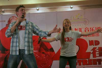 昨天下午,《42街》的幾位主演來到深圳大廈舉行了媒體見面會(huì)。為了增加現(xiàn)場(chǎng)氣氛,兩位中國年輕的踢踏舞演員被請(qǐng)上臺(tái),一段熟練的舞蹈動(dòng)作顯示了不俗的實(shí)力。盡管跟現(xiàn)場(chǎng)這些來自百老匯的專業(yè)舞者無法相提并論,但是他們的表演還是贏得了一片掌聲,而百老匯的演員們更是起身鼓掌叫好。而《42街》的演員們也現(xiàn)場(chǎng)露了一手,從小就學(xué)習(xí)跳舞、唱歌的男主角查爾斯和畢業(yè)于音樂劇學(xué)校的女主角克利斯汀用聲情并茂的表演充分顯現(xiàn)出了他們的演唱功底。