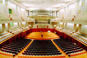 在公共空間的另一側(cè),是設(shè)計(jì)獨(dú)特的戲劇場。戲劇場共計(jì)有1035個席位,具有濃郁民族色彩的絲布墻面體現(xiàn)出戲劇場親切、熱烈而傳統(tǒng)的氣氛,平時主要以戲曲、話劇演出為主。劇場內(nèi)設(shè)置的“鼓筒式”轉(zhuǎn)臺是根據(jù)德累斯頓歌劇院和英國皇家芭蕾舞劇院的舞臺組合出的新型轉(zhuǎn)臺,可以達(dá)到15塊臺邊移動、邊升降、邊旋轉(zhuǎn)的舞臺效果———演出話劇《江姐》的時候,只消升起兩塊臺板構(gòu)成一個立體矩形,前邊再放上一只火盆,就構(gòu)造出渣滓洞監(jiān)獄的陰森場景;如果把這些臺板漸次升起,就是可供合唱團(tuán)站立的標(biāo)準(zhǔn)性臺階;如果把臺板按需要升起后再進(jìn)行圓臺旋轉(zhuǎn),那么戲劇導(dǎo)演可以在數(shù)個舞臺場景瞬間切換。