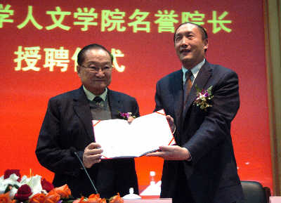 筆挺的黑西裝,黑亮的頭發(fā)整齊地后梳,昨日,83歲的金庸,氣定神閑地出現(xiàn)在浙江大學(xué)紫金港校區(qū)。雖然金庸口齒有些不清,走路也需要人攙扶,但絲毫不影響散發(fā)的英氣。他接過浙江大學(xué)校長楊衛(wèi)遞過的“名譽院長”聘書那一瞬間,意味著他正式卸任了浙大人文學(xué)院院長,可以靜心在英國讀書,并有望在未來的兩年內(nèi)拿到“貨真價實”的英國劍橋大學(xué)歷史學(xué)博士學(xué)位。