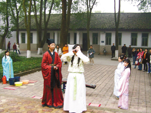 迎賓、洗爵、行拜禮……昨下午,在西南大學(xué)蜀園的孔子像前,20多個(gè)學(xué)生進(jìn)行了“鄉(xiāng)飲酒禮”儀式。他們分別扮成主人和賓客,“賓客”將酒杯舉在腰間,向“主人”鞠兩躬,“主人”作揖還禮后,“賓客”再慢慢地將杯中的米酒喝下,為了表示對(duì)“主人”的尊敬,杯里的酒不能全部喝完。隨后,他們還齊聲朗誦了《關(guān)雎》、《鹿鳴》等《詩(shī)經(jīng)》中的名篇。整個(gè)儀式持續(xù)了近2個(gè)小時(shí),將這一古老儀式的12個(gè)步驟演繹得十分逼真。