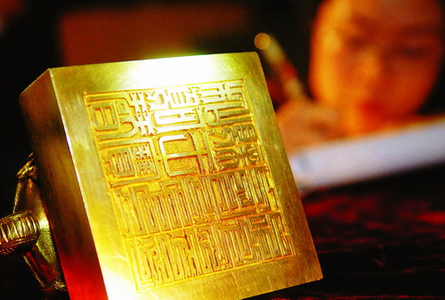 你能想到一方金印的最大重量是多少?昨天,在武漢市博物館的文物點(diǎn)交現(xiàn)場,嘉慶皇帝冊封當(dāng)時還是皇子的道光帝為智親王時所頒授的10公斤重的“和碩智親王”金印引起眾人驚嘆!霸幸晃荒暇┎┪镌汗ぷ魅藛T要將此印拿起,居然連試了2次都沒成功,這金印可重著呢!爆F(xiàn)場文物專家介紹說,除“和碩智親王”金印,此次點(diǎn)交文物還有皇帝金發(fā)塔、青花十二月花卉杯、銅琺瑯太平有象等,件件彌足珍貴。