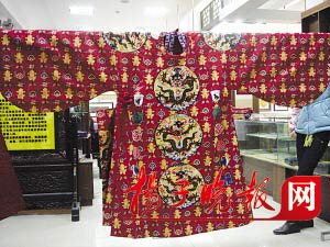 細(xì)看款式,圓領(lǐng),大袖,窄袖口,全身繡的“壽”字多達(dá)256個,與“!敝C音的蝙蝠有301只,如意紋271個,寓意“福壽萬代”!靶柗鄙黹L136厘米,下擺寬150厘米,肥肥大大,據(jù)說是皇帝最隆重的衣服,明代崇尚紅色,朱元璋規(guī)定“正旦、冬至、圣節(jié)日(皇帝生日)、祭社稷、先農(nóng)、冊拜等大典穿袞服”。明朝對袞服的織造一般由內(nèi)織染局承辦,織造前先由欽天監(jiān)選擇吉日,再由禮部提請,遣大臣祭告,方可開工。
