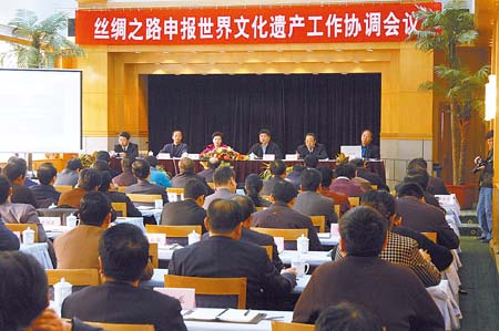 12月28日上午9時,絲綢之路申報世界文化遺產(chǎn)工作協(xié)調(diào)會議在蘭州飯店8樓會議室召開,國家文物局局長單霽翔、甘肅省副省長咸輝、國家文物局文物保護(hù)司司長顧玉才及79名相關(guān)省區(qū)代表參加了當(dāng)天的會議。會上,單霽翔向與會代表強調(diào)了絲路申遺的重大意義,并指出了全國48個申遺點存在的問題和不足。
