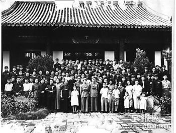 這張老照片可不是大戶人家的集體合影,而是一張不同尋常的結(jié)婚照。其不尋常之處在于:它反映了北京和平解放后,第一個(gè)新式婚禮的隆重場(chǎng)面。照片中間位置胸戴大紅花,表情有些羞澀的一對(duì)新人正是新式婚禮的主角。