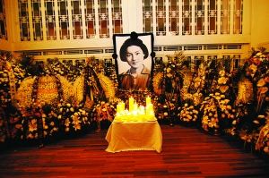 進(jìn)入院門,穿過兩趟弄門,北屋門外有一幅黑底白字的挽聯(lián),上聯(lián)為“國(guó)之瑰寶一代名媛笑談春秋猶未盡”,下聯(lián)是“胸含海岳滿腔深情歷經(jīng)風(fēng)雨終不悔”,中間寫著“章含之千古”。進(jìn)入設(shè)在客廳的靈堂,幾十個(gè)花圈花籃簇?fù)碇粡堈潞贻p時(shí)的黑白照片,照片里的她微微含笑;ㄈɑ@里全是鮮花,房間里散發(fā)著濃濃的百合香。擺在正中間的花籃來自她最喜愛的外孫女章冕,這也是她晚年最大的希望與寄托。
