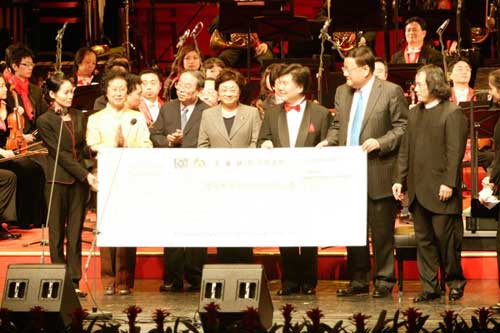 全場的最高潮無疑是3家主辦方?jīng)Q定將門票收入所得共103.9720萬元票款的支票交到中華慈善總會代表的手中,委托其捐獻(xiàn)給受雨雪災(zāi)害最嚴(yán)重的湖南、貴州、廣西等省區(qū)市時(shí),觀看演出的觀眾紛紛起立,掌聲如雷鳴般鼓動。