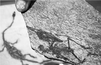 記者有幸在開(kāi)展的第一時(shí)間看到了這件標(biāo)本。這只像燕子般大小的史前動(dòng)物,此時(shí)靜靜地躺在灰黑色的頁(yè)巖中,全身的化石骨架保存得完好而精美,全身的骨骼呈黑色,凸現(xiàn)在巖石上,清晰可見(jiàn),煞是可愛(ài)。它的嘴巴尖長(zhǎng),嘴里看不到一顆牙齒,眼睛很大,前翅伸出,后肢舒展。它的發(fā)現(xiàn)者和主要研究者、中科院古脊椎所研究員汪筱林博士告訴記者,由于這只翼龍?bào)w型如此嬌小玲瓏,發(fā)現(xiàn)初期人們還無(wú)法判斷其個(gè)體發(fā)育年齡:是剛剛出生不久的“新生兒”,還是已經(jīng)成長(zhǎng)為“青少年”,或者已經(jīng)進(jìn)入成年?