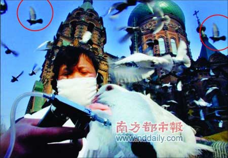 [提要] 現(xiàn)在是“大家來找碴”時(shí)間,06CCTV年度十大新聞圖片《藏羚羊生命中的十道難關(guān)——鐵路關(guān)》已被成功鑒定為假照片。今天推出的這張是2005年首屆華賽金獎(jiǎng)作品《廣場(chǎng)鴿接種禽流感疫苗》。作者否認(rèn)曾修改照片,但當(dāng)年華賽評(píng)委蔣鐸認(rèn)為兩只鴿子是PS無疑。接下來讓我們一起等待專家調(diào)查。