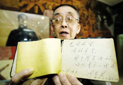 昨日,張治中將軍之子、全國港澳臺僑聯(lián)誼會會長、79歲的張一純老人專程從北京趕來,從衣兜里小心地掏出了一本黑色硬面抄,里面有周總理為他的題詞,這是老人最珍貴的物品。