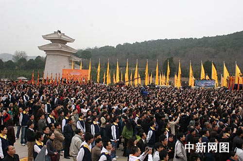 中新網(wǎng)黃陵4月4日電 (朱鵬英)2008年4月4日上午9時(shí)50分,戊子年清明公祭軒轅黃帝典禮在陜西黃陵縣橋山正式開始,來自海內(nèi)外的八千多名中華兒女聚集在黃帝陵前,共同祭拜中華民族的"人文始祖"軒轅黃帝,緬懷共同的先祖。