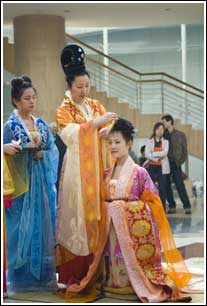 為了讓現(xiàn)代人感受傳統(tǒng)節(jié)日的文化內(nèi)涵,昨天上午9點(diǎn),30余位愛好漢服文化的網(wǎng)友相聚在西安博物院,他們身著傳統(tǒng)漢服,現(xiàn)場(chǎng)演示古代女子的成人禮——笄禮。昨天的笄禮儀式十分莊重,因?yàn)榧磳⑿畜嵌Y的女子是一位唐朝“公主”!肮鳌彼┓b為唐代皇室貴族的佃釵大禮衣系列,高雅華貴。