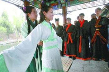 兩名女大學(xué)生正在展示漢服。昨日,20多名女大學(xué)生相聚清華大學(xué),她們身著傳統(tǒng)漢服,演示了古代女子的成人禮———笄禮。女學(xué)生們進(jìn)行了三次叩拜,拜天地、拜父母、拜祖國(guó);三次加裝,服飾一次比一次華貴,象征女子成長(zhǎng)的過(guò)程。最后經(jīng)過(guò)上香、敬酒等多個(gè)程序,成人禮才宣告結(jié)束。笄禮是古代女子訂婚以后、出嫁之前所行的禮,目的是對(duì)她們的人生責(zé)任、社會(huì)角色進(jìn)行提醒。
