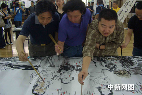 來(lái)自浙江畫(huà)院的池沙鴻等畫(huà)家共同完成向?yàn)?zāi)區(qū)遇難同胞表達(dá)哀思的作品。