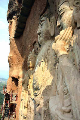 麥積山數(shù)百個(gè)石龕中,薈萃著上迄后秦下至清朝的十多個(gè)朝代的各種塑像。
