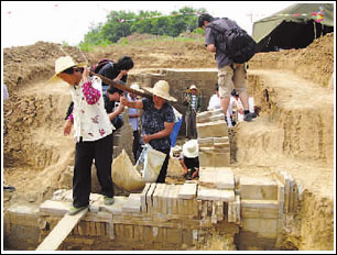 據介紹,這座古墓長8米、寬3米。是南朝墓葬常見的磚結構“凸”形單室券頂磚墓。特別之處在于,墓室下的排水系統(tǒng)保存非常完好,長約7米,出水處清晰可見,這么完整的古墓在以往的六朝古墓中也是少見的。一位考古隊員向記者介紹說,另外每隔十多米就有一處墓葬,“這絕對是一個令人側目的奢華墓群,可惜其他幾座都遭破壞了!