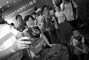 一名工作人員展示飛行員專用相機(jī)。昨天是抗戰(zhàn)全面爆發(fā)71周年紀(jì)念日,20余件飛虎隊(duì)文物落戶中國人民抗日戰(zhàn)爭(zhēng)紀(jì)念館。這批文物是現(xiàn)年91歲的原飛虎隊(duì)成員吳其軺在抗戰(zhàn)時(shí)期配發(fā)的用品。如此批量、成套的飛虎隊(duì)文物在國內(nèi)同時(shí)披露非常少見。(記者 薛珺 蔣彥鑫 攝影報(bào)道)