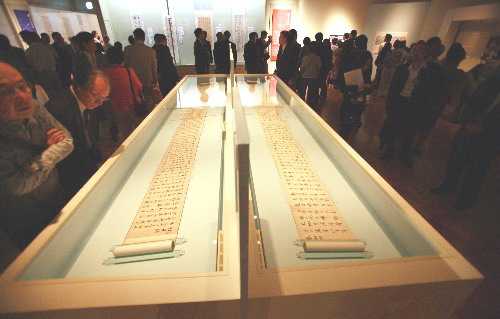 7月14日,在日本東京,人們?cè)诮瓚魱|京博物館舉行的預(yù)覽會(huì)上觀賞故宮所藏的書法作品。為紀(jì)念中日和平友好條約締結(jié)30周年,7月15日起,以王羲之《蘭亭序》為代表的65件北京故宮館藏歷代書法名品將在東京進(jìn)行為期2個(gè)月的展出 。其中,《蘭亭序》是首次在日本亮相。