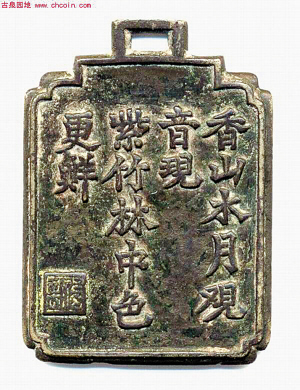 “香山水月觀音現(xiàn),紫竹林中色更鮮!弊蛉眨粔K刻有無名詩句的清代古銅牌現(xiàn)身渝北區(qū)。對此牌,收藏界有兩種說法。一說,此牌是“名妓號牌”;二說,是當(dāng)時某地下組織的“會員證”。