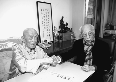 “您是我們國(guó)家最高的老師!”10月28日下午,香港著名學(xué)者饒宗頤(上圖右)專程來(lái)到北京解放軍總醫(yī)院看望北京大學(xué)教授季羨林時(shí),這樣稱呼這位學(xué)界泰斗(圖為王天天攝)。