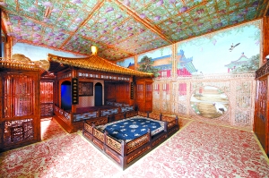 上午,記者在修復(fù)完工的倦勤齋內(nèi)看到:倦勤齋共面闊9間,以木裝修隔成了上下兩層的凹字形仙樓。最巧妙的是,齋內(nèi)各房間之間均以隔扇、檻窗、落地罩、炕罩等隔成相對獨(dú)立的空間。齋內(nèi)用歐洲透視方法繪出的絹面通景畫覆蓋了整個房間,據(jù)介紹整個倦勤齋有70余張畫,其中頂棚處有12張,全部約170平方米,如此大量反映18世紀(jì)歐洲美學(xué)對中國裝飾藝術(shù)影響的通景畫,不僅在紫禁城而且在全中國也是絕無僅有的。當(dāng)年乾隆皇帝觀戲的小戲臺被裝飾得古色古香,戲臺上方的天花板上全部都是枝藤茂密的紫羅蘭圖案通景畫,房間的墻壁上則細(xì)膩地描繪了紫禁城里的建筑和山石景色。而在以仙樓圍成的中廳內(nèi),精美的竹絲鑲嵌、玉雕和木雕藝術(shù)同樣令人嘆為觀止。