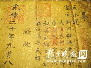 昨日下午,記者在張先生家看到了這幅“清朝圣旨”,看上去比較陳舊!笆ブ肌睂40厘米,長70厘米,質(zhì)地為黃色織綿,四角有黃龍暗紋。從文字上看,“圣旨”右側(cè)以“奉天承運(yùn),皇帝制曰”起頭,楷書內(nèi)容為“新法之施于民亦大利也,欽命康有為入京專心擬其新綱,力求創(chuàng)新以尚吾天顏,欽此。光緒二十年九月八日”,左側(cè)為滿文。記者看到,“圣旨”上蓋有光緒皇帝玉璽、翰林院等三枚大印,其中一方已模糊不清。