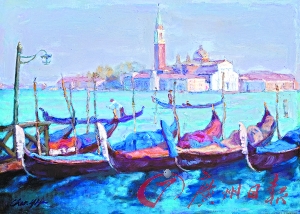 而陳逸飛的《威尼斯》以前從沒有拍賣過,是現在的擁有人1999年直接向畫家購買的。取景是威尼斯著名的大運河 ,前面泊著4艘運河木船 ,運河上另有兩艘木船,對岸是著名的圣馬可大教堂。朦朧的煙霞,叫人分不清是早晨還是黃昏。采用的意象表達手法是陳逸飛作品中極為罕有的。早在1990年,畫家曾繪過一幅同名的風景畫。然而兩幅畫有很大的不同。1990年那一幅層次較分明,色彩也較濃烈,采用的是陳逸飛一貫的寫實手法。9年后的《威尼斯》用色較淡,景物的處理較隨意,很有印象派大師莫奈的影子。