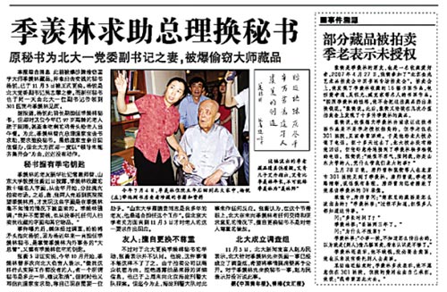 然而,有關(guān)渠道昨日披露的數(shù)段有關(guān)人士早先攝錄的季羨林視頻,畫面上思路、語言清晰的季老表達(dá)了對“丟畫”和北大聲明的看法,季羨林說:“(丟畫)千真萬確,我知道。當(dāng)面叫你季爺爺、季爺爺,背后偷你的畫偷畫的事情,誰也掩蓋不了。” 自稱拍得大批“季羨林珍貴書畫”的收藏家張衡10月份爆出季羨林收藏被盜賣的消息,隨后,新華社記者唐師曾在博客披露此事,季老的秘書楊銳成為被懷疑對象之一。11月初,北大給季老增派助手并成立調(diào)查組。隨后幾天,北大發(fā)表聲明:外流拍賣字畫并非季老真藏,季老秘書保管的季老藏品并未外流。11月26日,北大通報調(diào)查結(jié)果:“舉報人”手中字畫全系偽作,“盜賣沒有任何根據(jù)”。