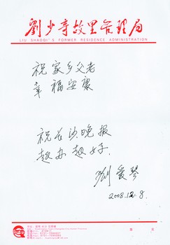 今年11月24日是劉少奇誕辰110周年,此次來(lái)參加紀(jì)念活動(dòng)以及昨日追憶活動(dòng)的劉愛(ài)琴是近五年來(lái)第一次回家鄉(xiāng)!凹亦l(xiāng)變化很大,發(fā)展也很好,如果父親看到這些變化,相信也會(huì)感到很欣慰的!眲(ài)琴說(shuō)。對(duì)家鄉(xiāng)父老,劉愛(ài)琴深深牽掛。昨日在劉少奇紀(jì)念館,劉愛(ài)琴專(zhuān)門(mén)托本報(bào)向家鄉(xiāng)父老問(wèn)好,書(shū)寫(xiě)了“祝家鄉(xiāng)父老幸福安康”,同時(shí)寄語(yǔ)本報(bào):“祝長(zhǎng)沙晚報(bào)越辦越好”。