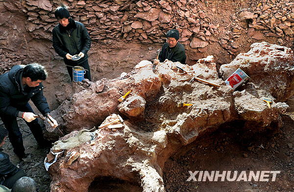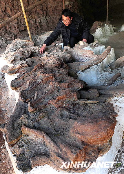 河南省汝陽縣恐龍化石發(fā)掘近日又有重大進展,在汝陽縣劉店鄉(xiāng)發(fā)現(xiàn)了成片密集化石區(qū),出土的恐龍化石形體巨大,粗壯異常,其中最大的一塊長3.3米、寬2.3米。經(jīng)專家認定,這塊巨型恐龍化石比2007年7月命名的亞洲最大恐龍化石“汝陽黃河巨龍”大很多,究竟屬于什么恐龍屬種還需進