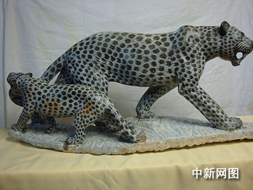 非洲匠人用5年時(shí)間打磨出來的等比等高“母子豹”石雕。