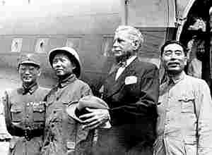1945年8月28日,毛澤東赴重慶談判。臨行前,他換了換裝,穿上了葉劍英特地給他買的皮鞋和在北京給他訂做的一套藍(lán)灰色中山裝。江青到蘇聯(lián)醫(yī)生阿拉夫那里為毛澤東借來(lái)了一頂禮帽。周恩來(lái)上上下下打量毛澤東這身裝束,毛澤東說(shuō):“怎么,嫌我穿得太洋氣?”周恩來(lái)說(shuō):“不,我是看主席戴的帽子好像有點(diǎn)小。”說(shuō)著,摘下自己頭頂上的盔式太陽(yáng)帽遞給毛澤東:“主席,你戴上這頂試試,重慶的日光是很強(qiáng)烈的!泵珴蓶|接過(guò)太陽(yáng)帽戴上,不大不小正合適。周圍的同志也說(shuō)好。毛澤東風(fēng)趣地說(shuō):“恩來(lái),我可奪人所好啰!”并問(wèn)周恩來(lái):“你戴什么呢?”周恩來(lái)說(shuō):“我還有,再說(shuō),重慶我比你熟,總可以搞到一頂,這頂就送給你吧!庇谑,毛澤東就戴上這頂盔式太陽(yáng)帽登上飛機(jī),去了重慶,并在重慶機(jī)場(chǎng)留下了一張頭戴盔式禮帽的歷史照片。