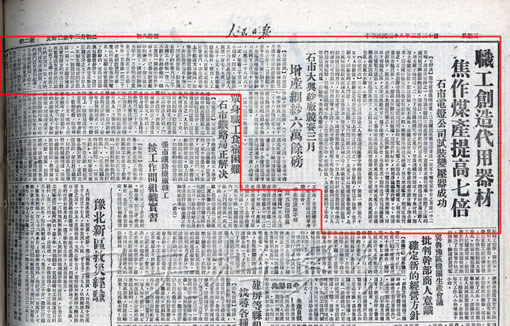 3. 1949年3月30日,《人民日報(bào)》關(guān)于焦作煤產(chǎn)提高七倍及石市紗廠增產(chǎn)細(xì)紗六萬余磅的報(bào)道