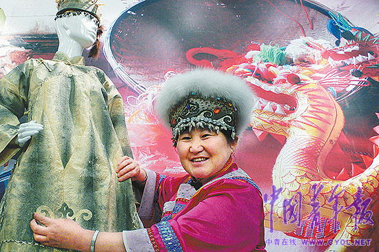 在今年2月北京舉辦的中國(guó)非物質(zhì)文化遺產(chǎn)傳統(tǒng)技藝大展上,這件魚皮衣服吸引了無(wú)數(shù)眼球。頭戴雪兔毛魚皮帽,腳穿魚皮靴子的尤文鳳,坐在展臺(tái)前,不厭其煩地回答著觀眾的問(wèn)題。