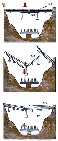 所謂連環(huán)翻板,即在墓道中挖掘深約3米以上的陷坑,長(zhǎng)短與寬度視墓道具體情形而定,坑下分布約10厘米左右的刀錐利器。坑上層平覆數(shù)塊木板,木板中間有軸,下綴一小型相同重量的物體,呈天平秤狀,板上有掩蓋物。若盜墓者踏上木板,板的一端隨之下陷,人必掉到坑內(nèi)的刀錐之上。
